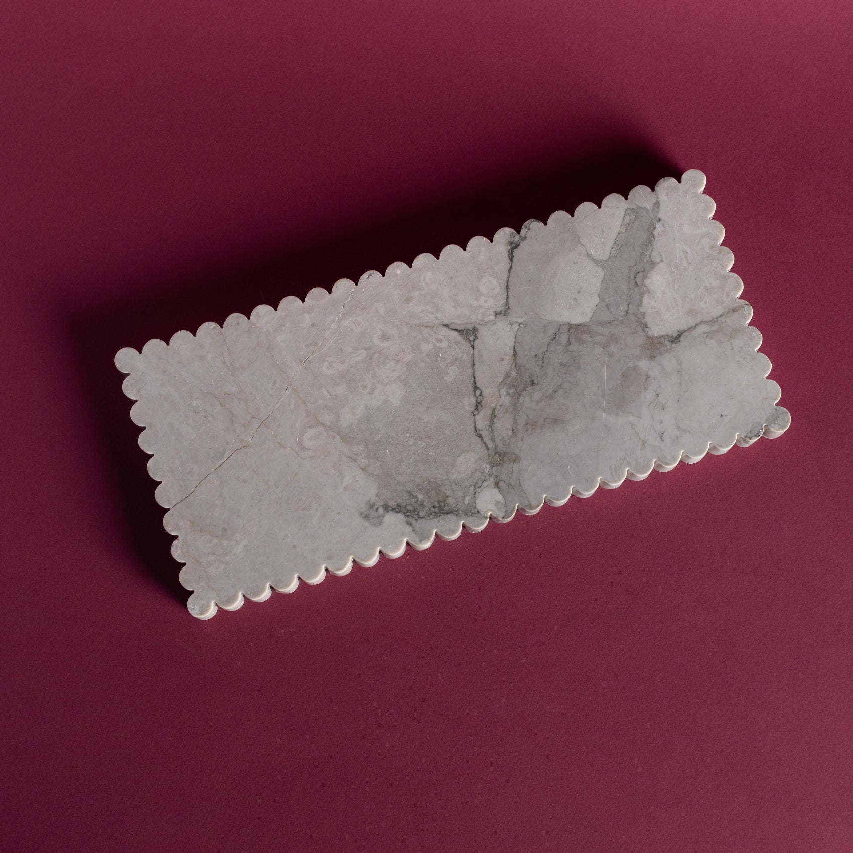 Defined by soft geometry and hand-finished marble, the Meridian Recatangular Tray brings subtle rhythm to everyday settings. Its narrow scallop and natural veining make each piece one-of-a-kind — a quiet presence in any space.