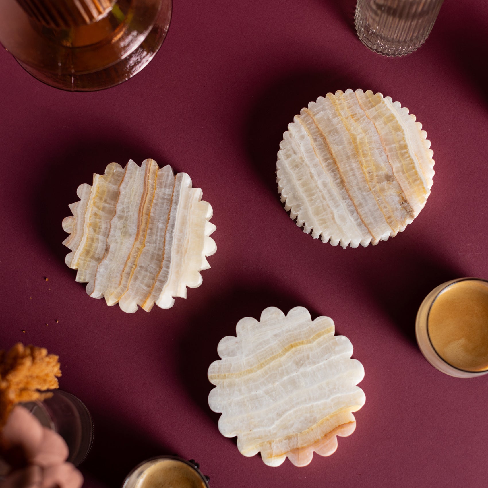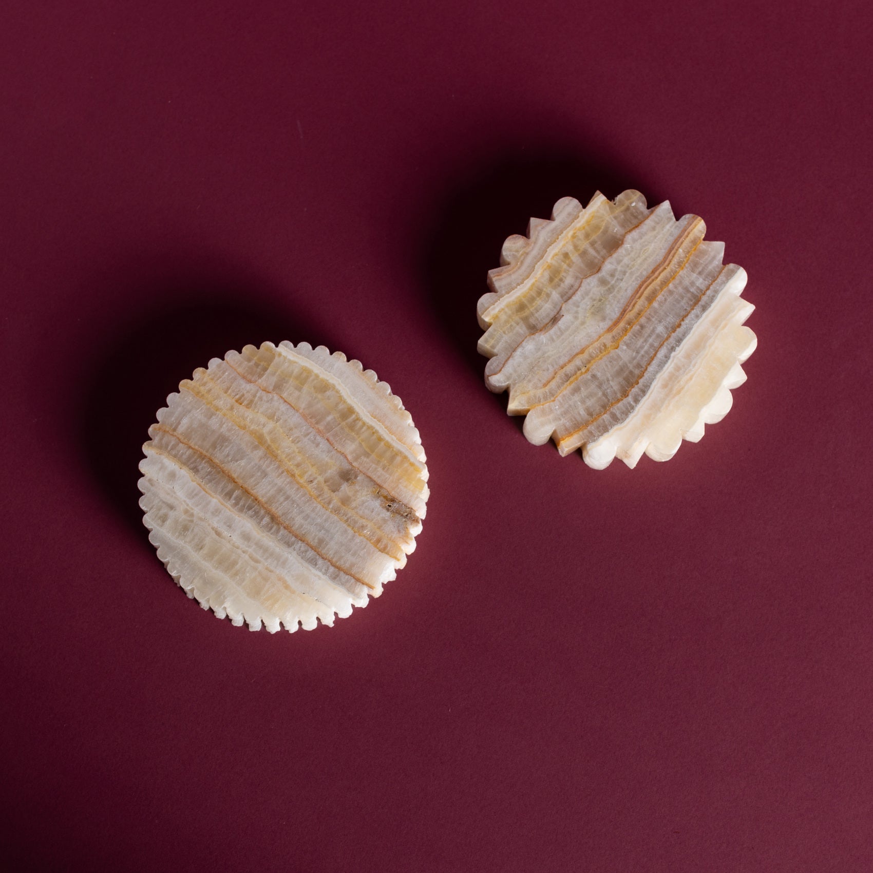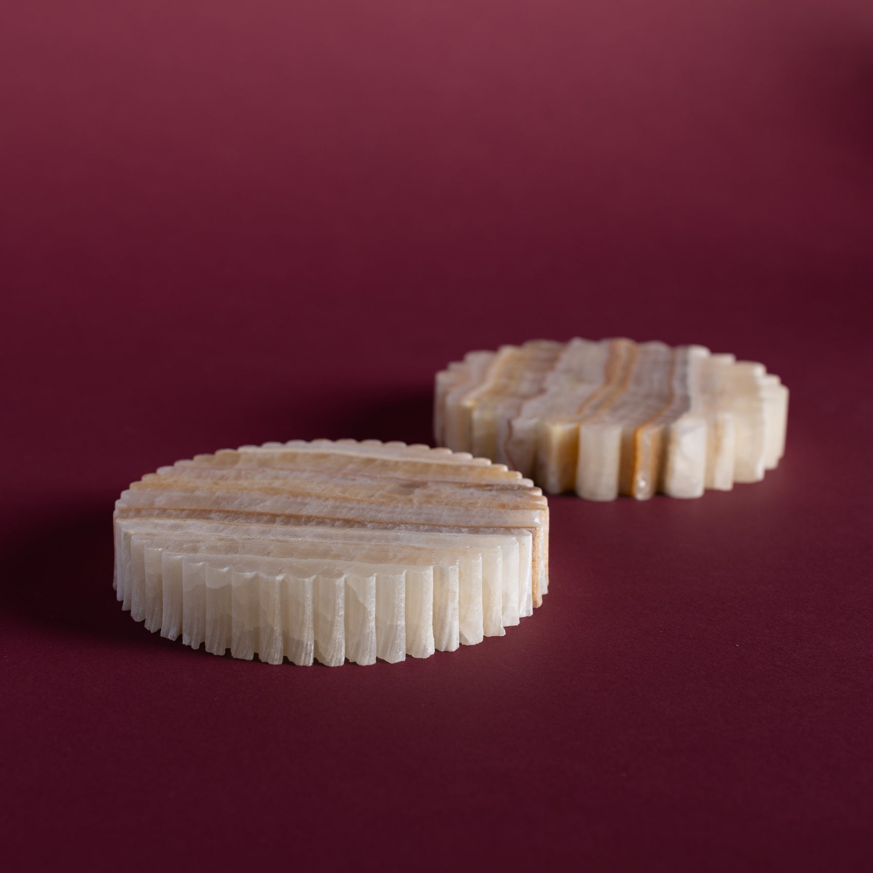 Defined by soft geometry and hand-finished marble, the Meridian Round Coaster brings subtle rhythm to everyday settings. Its narrow scallop and natural veining make each piece one-of-a-kind — a quiet presence in any space.
