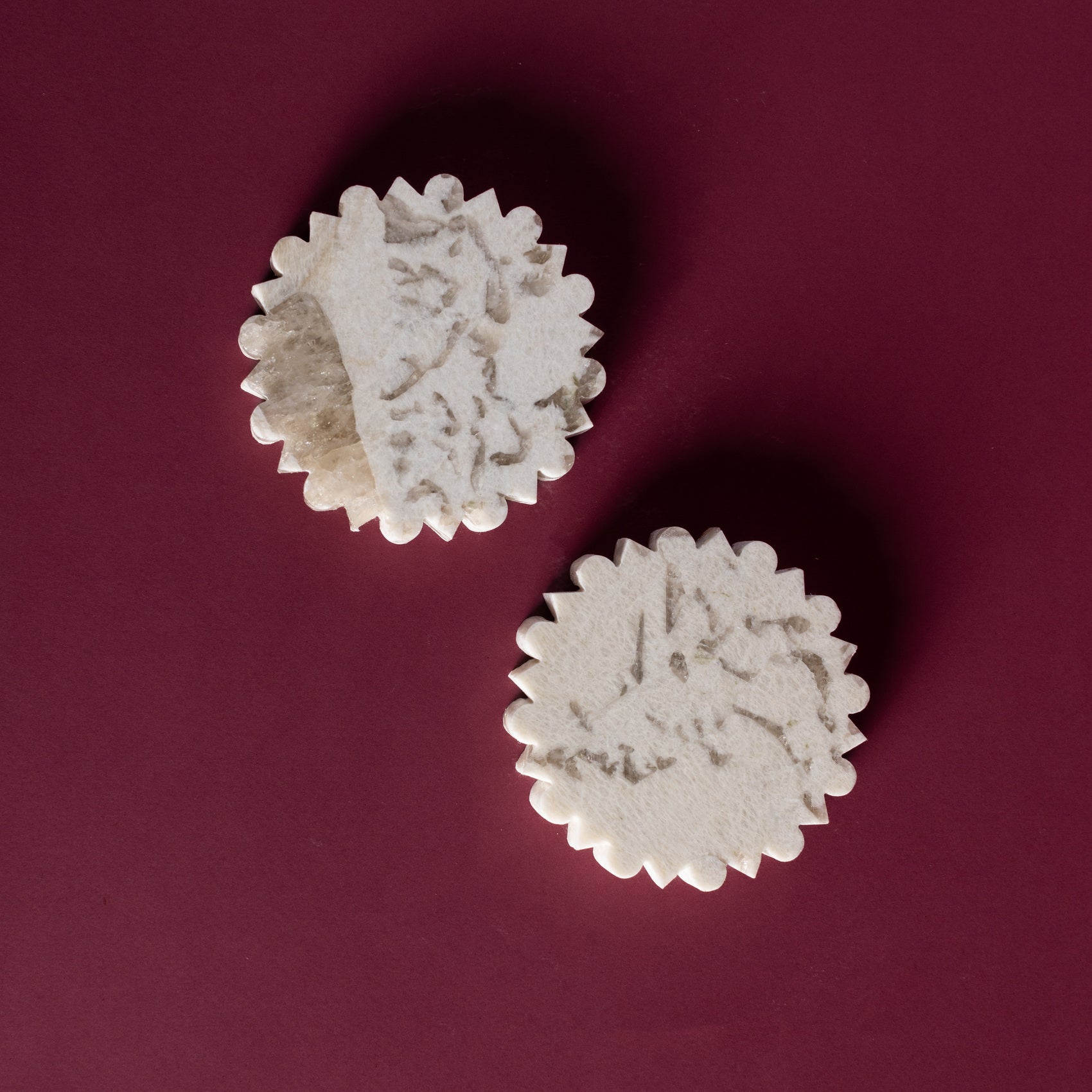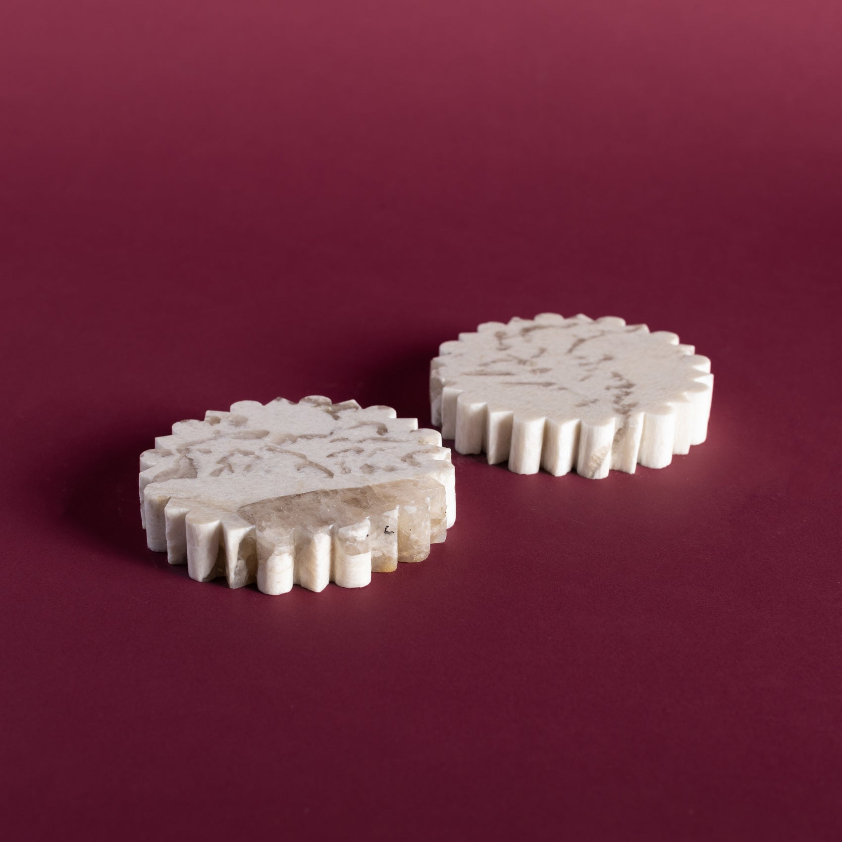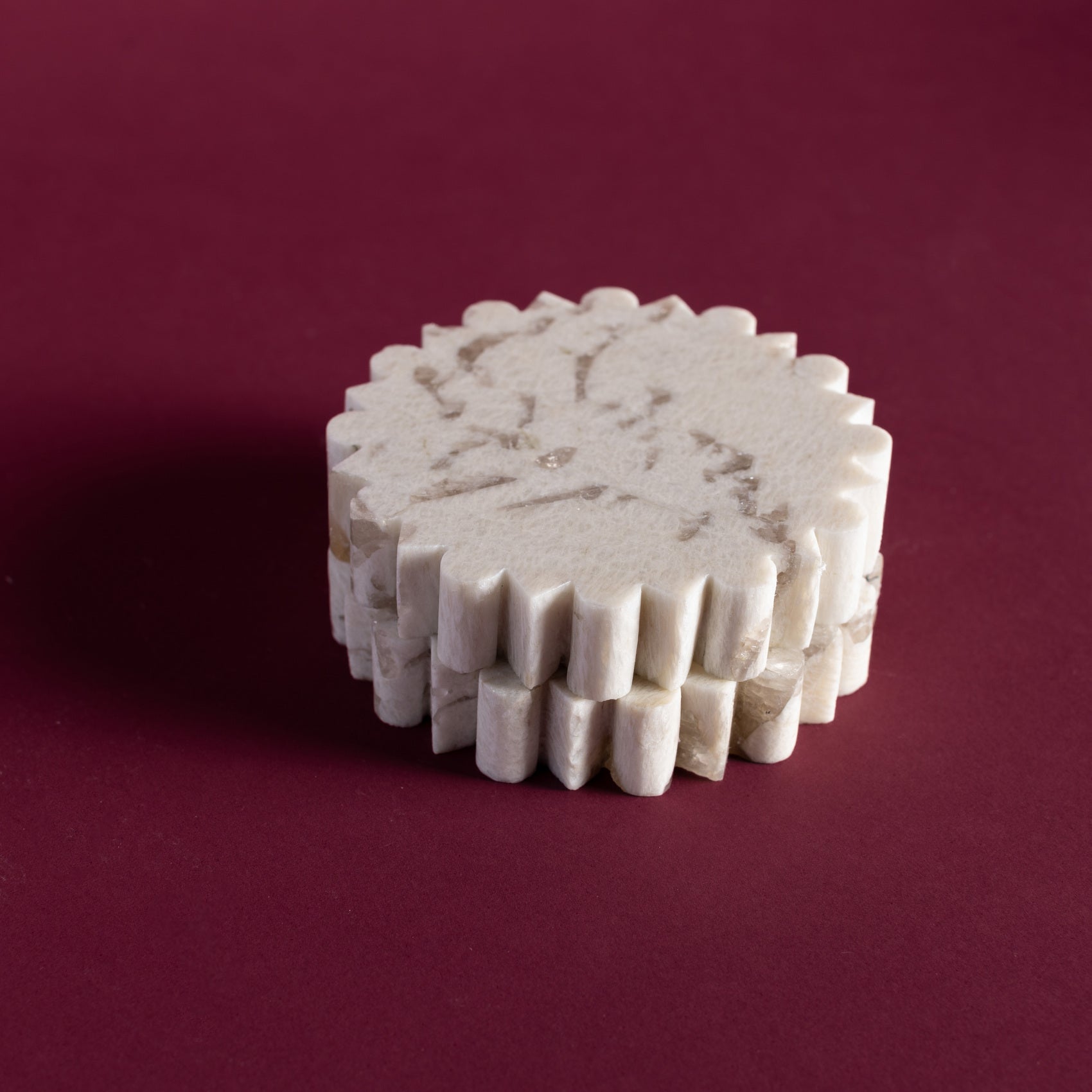 Defined by soft geometry and hand-finished marble, the Meridian Round Coaster brings subtle rhythm to everyday settings. Its mixed scallop and natural veining make each piece one-of-a-kind — a quiet presence in any space.
