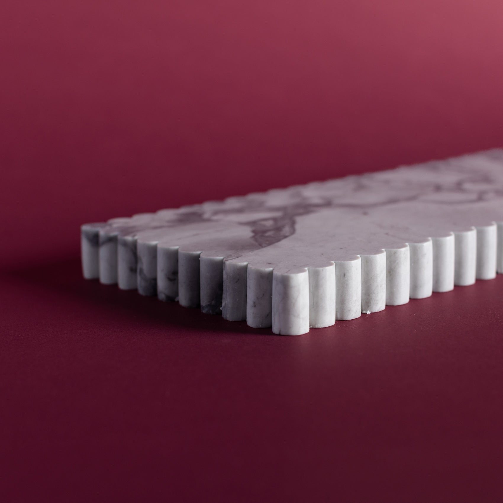 Defined by soft geometry and hand-finished marble, the Meridian Recatangular Tray brings subtle rhythm to everyday settings. Its narrow scallop and natural veining make each piece one-of-a-kind — a quiet presence in any space.