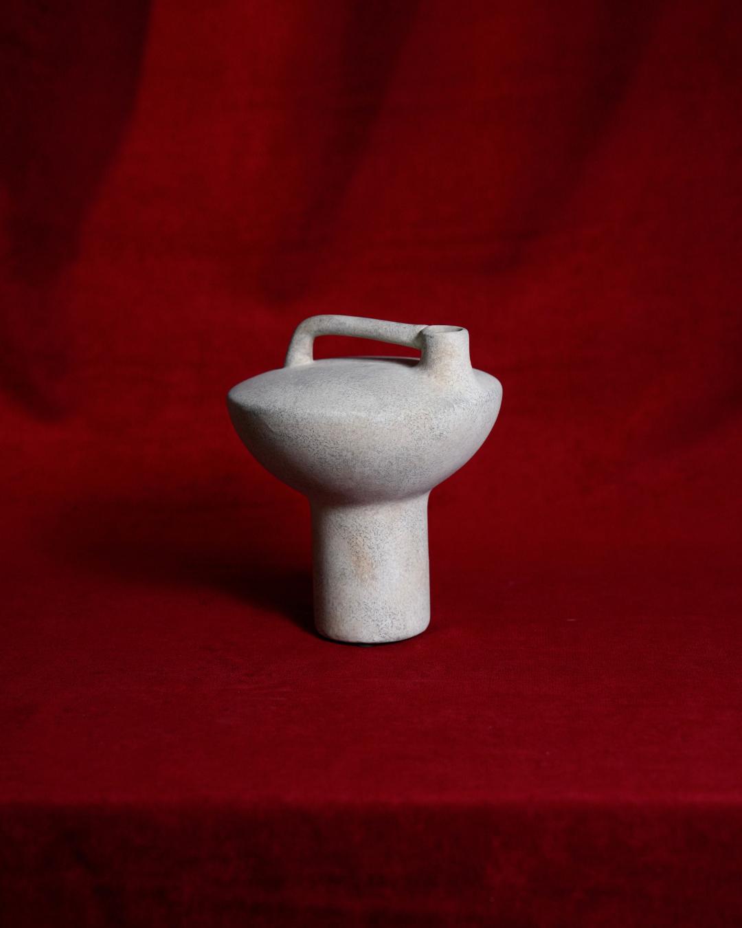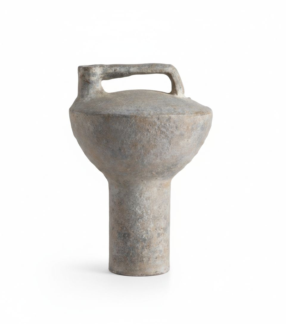 A squat, minimal form that feels almost like a weight or a seal. The integrated handle bridges utility with sculpture — a nod to ancient urns, reimagined as a spatial object.
